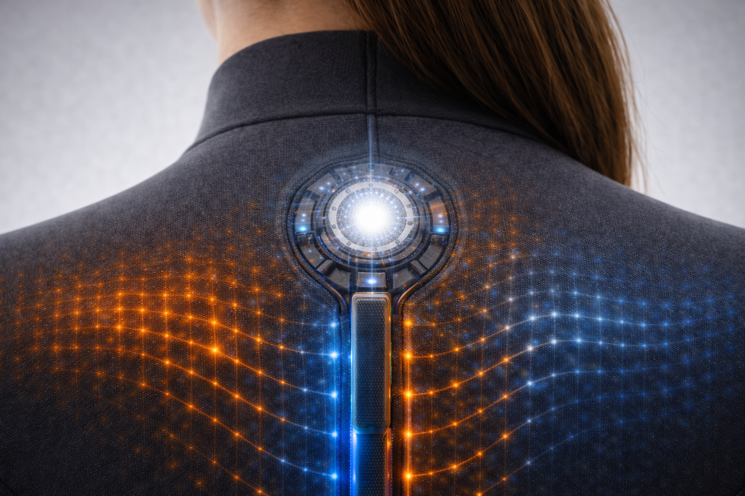 Smart Receptors convert the signals from the Smart Projector into the chosen EXO function. This is accomplished by the activation of the heating or cooling components in the attached Functionality Strip of the EXO. The Smart Receptors are powered by potent, rechargeable, lithium-ion batteries. They will be detachable for charging and able to fit into the Receptor Ports incorporated into every EXO model. Charging will be conducted via a Charging Station that the Smart Receptors are placed on, utilizing wireless power technology to restore the energy levels of the Smart Receptors. Smart Receptors will link to the Smart Projector software via Bluetooth or a custom communications wavelength. The Smart Receptor will be located at the center of the back, just below the neck for upper body models and at the point directly underneath the belt buckle for lower body models.