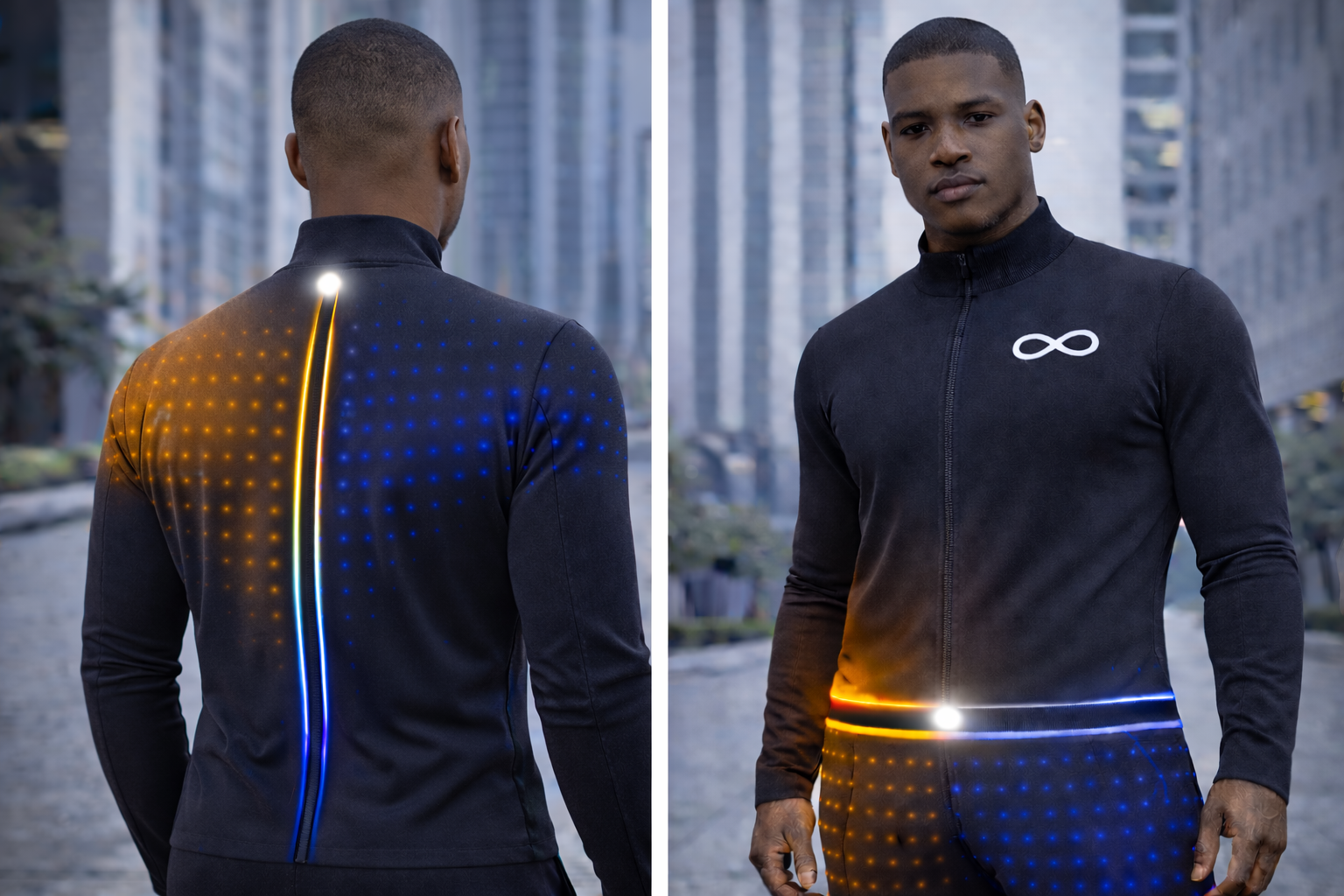The EXO is generated in levels, the greater of which encompasses the level below. The Innermost Level of the EXO is composed of the Functionality Strip and the parallel lattice of heating / cooling bands that extend from it. Encompassing the Innermost Level is the Middle Level, which uses Temperature Sensors to send the current temperature of the EXO to the Smart Receptor for communication to the user interface of the Smart Projector. The Middle Level also serves to protect the Innermost Level of electrical components from exposure to the elements, providing complete waterproofing and a degree of durable impenetrability while still allowing the permeation of heat. The Outer Level encompasses both the Middle and Innermost Levels, promoting the flow of heating or cooling to the side closest to the body while insulating the generated temperature from external conditions. The Outer layer of course displays the stylistic fashion of the EXO that makes it attractive to the market. While the prior levels are largely uniform in all initial product models, the Outer Level will provide the qualitative differentiations that distinguish the range of developed models. Each Level will be formed as thin and malleable as possible to allow for the greatest freedom of movement for our users.